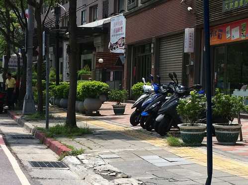 這是7/14第2天我拍到的照片,我想這不是大家想要狀況,如果放在人行道上的花盆還是很礙眼,那可能要麻煩里長小姐跟名人富邦社區的管委會聯繫,是否將其移至社區內,因為花盆是社區的.至於人行道上的狀況那就看過路人的運氣了,走10次10通順那就是好運了,運氣稍差點那就看過路人要搬機車還是和馬路爭道了.