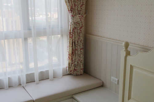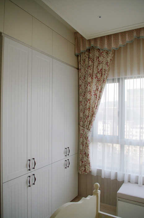 面學勤路的小女兒房, 主角為純白櫃體變化, 輔以古典床架, 白紗, 小碎花窗簾與壁布營造典雅婉約的芬圍.