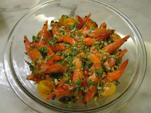 涼拌泰式海鮮更是請客騙人的好幫手: 蝦子蛤仔透抽川燙熟(別變老是唯一關鍵)用冰塊水冰鎮,泰式甜雞醬加檸檬汁魚露糖辣椒香菜蒜,海鮮加上小番茄芹菜淋上醬即可