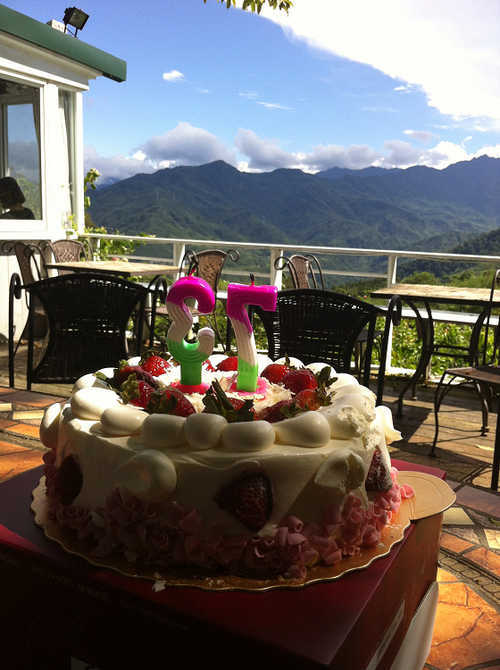 在室內吃完豐盛的套餐之後, 一夥人把蛋糕帶到室外, 在層巒疊翠與藍天白雲的背景中慶生, 真的有很特別的感受.....{:4_199:}