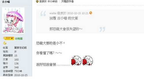 waitai 發表於 2010-10-15 10:21 回覆 古小喵 的文章 那恐龍大會很失望的~