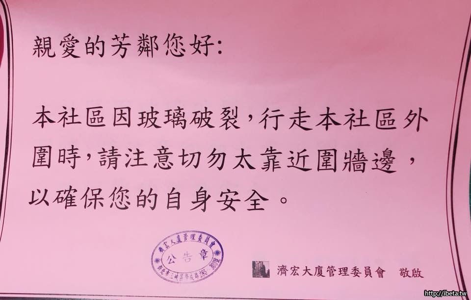 濟宏社區安全提醒⚠️大德路、學成路、大觀路濟宏社區,陽台玻璃有掉落危險,敬請民眾避免通行社區圍牆邊 ...