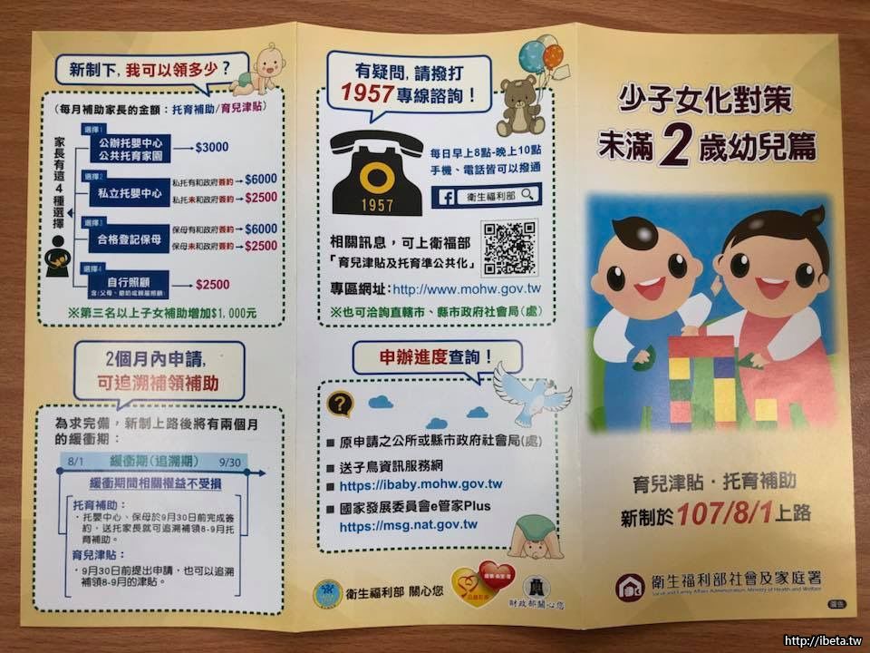 育兒津貼&托育補助資訊,107年 8月1日新制下,未滿兩歲幼兒篇,可以領多少?有疑問,請撥打1957專線諮詢。 ...