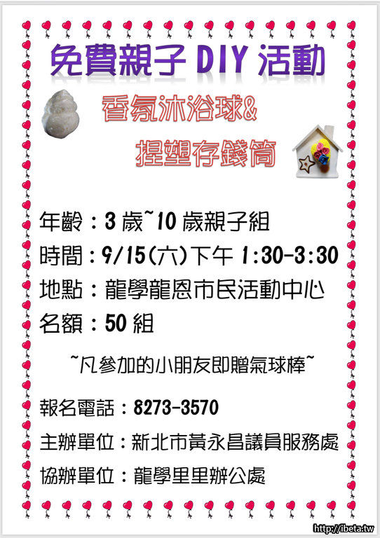 免費暑假親子DIY活動香氛沐浴球揑塑存錢筒,9月15日下午13:30至15:30,地點:龍學龍恩市民活動中心(學成路396號4樓)歡迎大家相揪來參加唷。《龍學里里長周秀鳳暨全體鄰長敬邀》