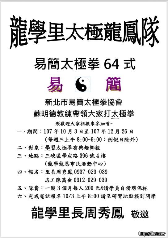 龍學里太極龍鳳隊開始招生囉,歡迎鄉親踴躍報名參加唷。《龍學里里長 周秀鳳 關心您》