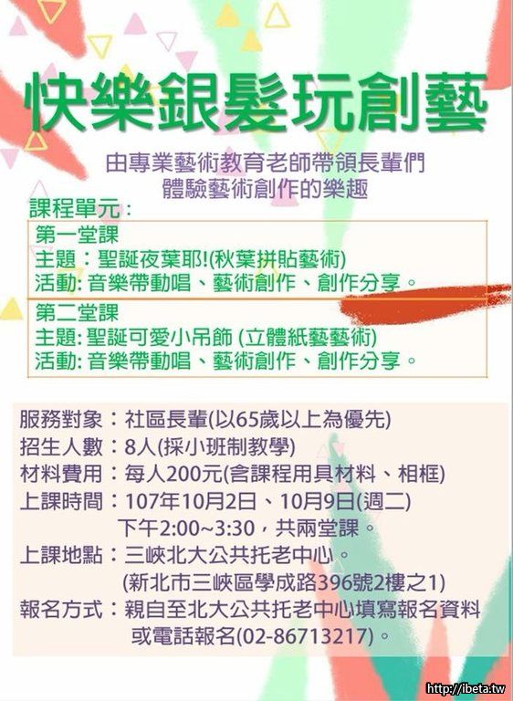 課程地點:三峽北大公共托老中心-銀髮俱樂部(三峽區學成路396號2樓之1)
