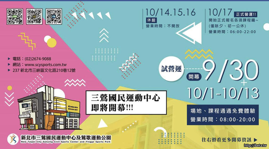 9/30上午10:30三鶯國民運動中心啟用暨試營運典禮,地點:三峽區文化路210巷12號。