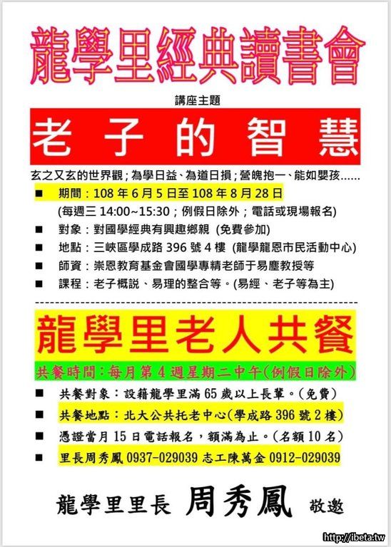 龍學里經典讀書會每週三下午及龍學里老人共餐每週二中午,歡迎里民踴躍報名參加。《里長周秀鳳暨全體鄰長敬邀》