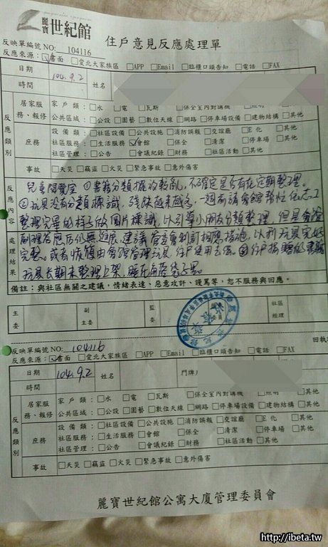 其實,現在社區雖然沒有家族網,仍是有住戶抱怨管道如下例,