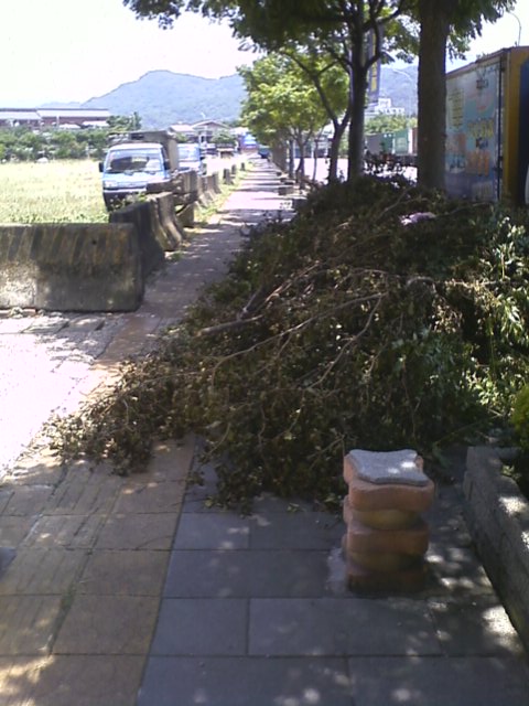 國慶路康橋水花園旁人行道上,上週五不知是何單位將修剪之樹枝堆放在此,擋住行人及自行 ...