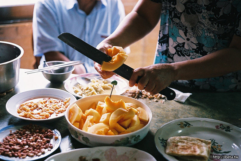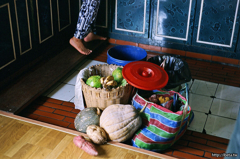 廚房裡堆著剛從田裡帶回來的南瓜、木瓜、香蕉、和野菜。
