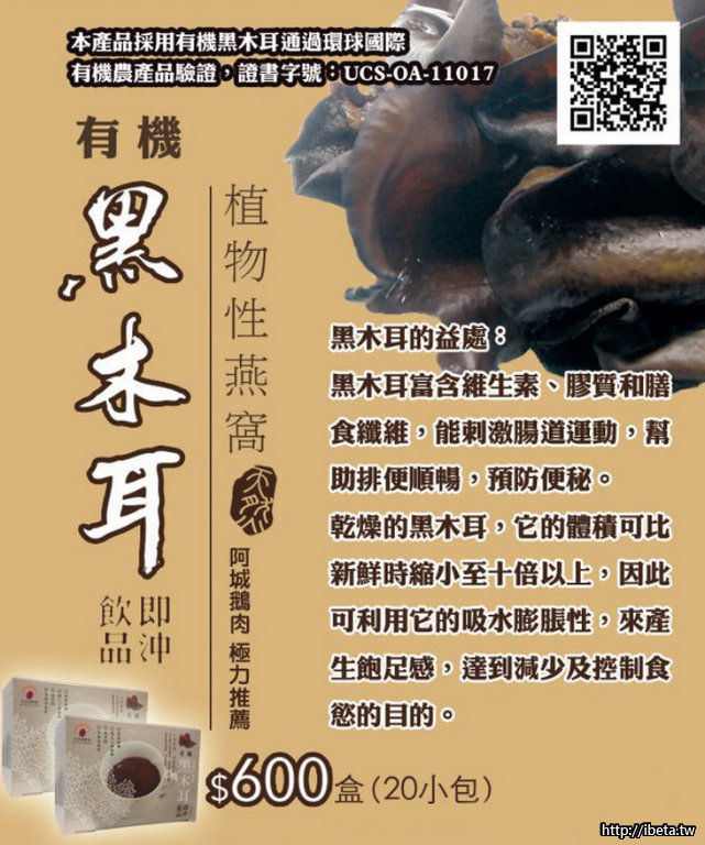 《有機黑木耳即沖飲》,設計為即沖飲品,採小袋包裝、一包一杯,適合於晨間、午茶時間、用餐前飲用,可代替早餐、下午茶果腹解饞,餐前飲用可控制食慾,飲用的同時,也攝取了黑木耳的各種營養素,是一箭好幾鵰的優良選擇。