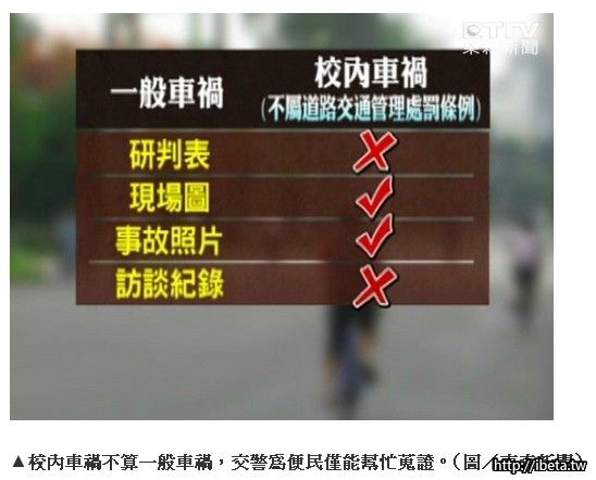 一般車禍交警會給研判表,找出肇事原因,還有現場圖、事故照片和訪談紀錄,不過,校內車禍不屬於道路交通管理處罰條例,員警就不會提供肇事研判表和訪談紀錄。