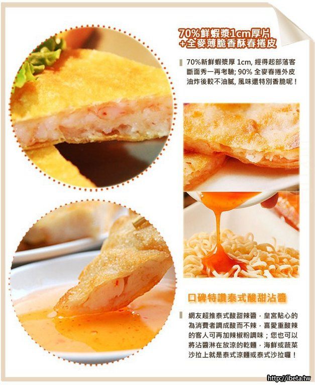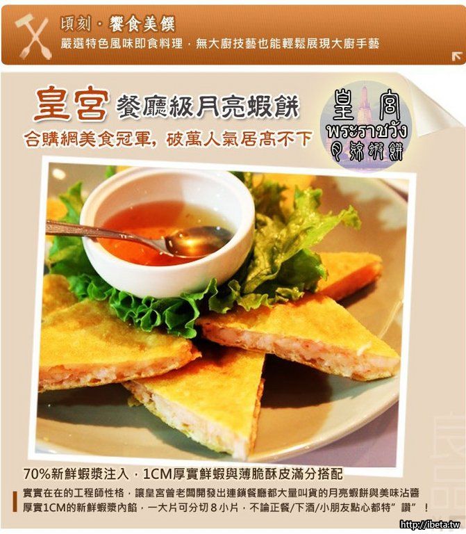 《皇宮月亮蝦餅》是餐廳等級的菜色,使用70%的新鮮蝦漿以及30%魚漿的黃金比例,還能夠吃到許多蝦肉,無論是煎是炸是烤都能品嚐到的酥脆外皮,以及附贈的泰式酸甜醬,可口美味盡在唇齒之間。 {:5_288:}