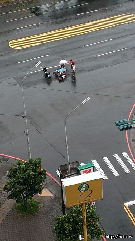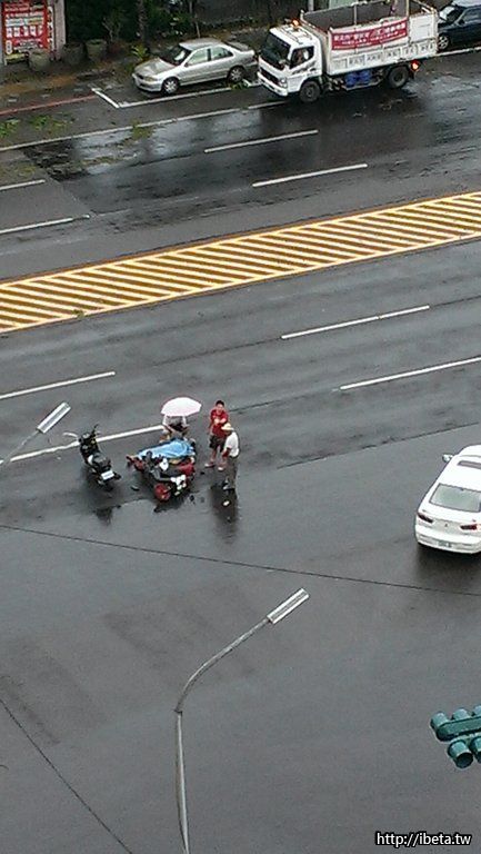 就在20分鐘前,在房間聽到砰的一聲,出來看到一輛機車倒在路中央,我沒有看到實況,事後推測是為了閃避轉彎的貨車造成的。我每天上班都會經過這個路口,這裡因為路寬又是T字路口,常有驚險畫面發生,大家行車經過此地要多多注意,尤其颱風剛過,天雨路滑。