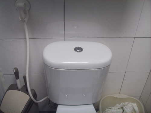 這個是我家的馬桶,髒了大家的眼,真的很抱歉啦! 左邊有拿來沖屁屁。左下方是我現在想要再買,也買不到的三合一垃圾桶(刷子、通馬桶、垃圾桶),右邊是我家小朋友布尿布的暫存清洗桶。........... {:4_175:} ... 怎麼最重要的衛生紙沒有了!