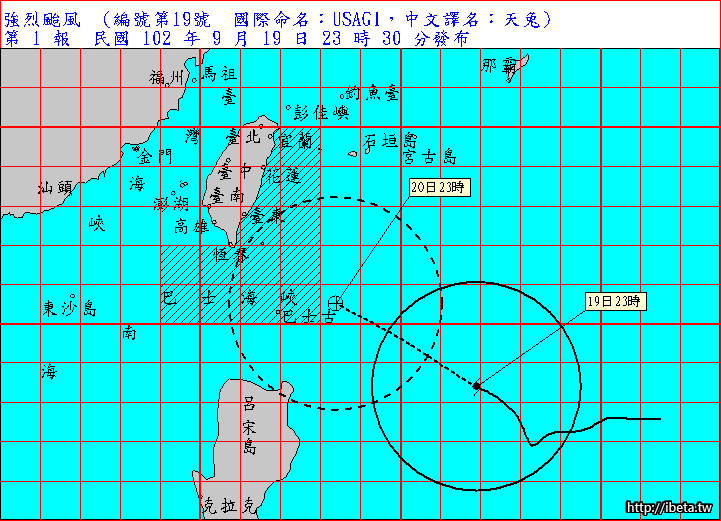 颱 風 強 度 及 編 號:強烈颱風,編號第19號(國際命名:USAGI,中文譯名:天兔)