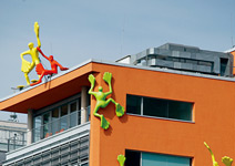 每層樓板的混擬土中都埋有管線,夏天可引100公尺外的萊茵河水,來幫大樓自然冷卻;冬天則藉著燒垃圾產生的熱能來補充熱水。這組樓板間的輻射冷熱水系統,可讓人類以最舒服的節奏,慢慢幫大樓調節溫度。