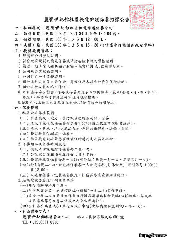 麗寶世紀館103年機電維護保養招標公告