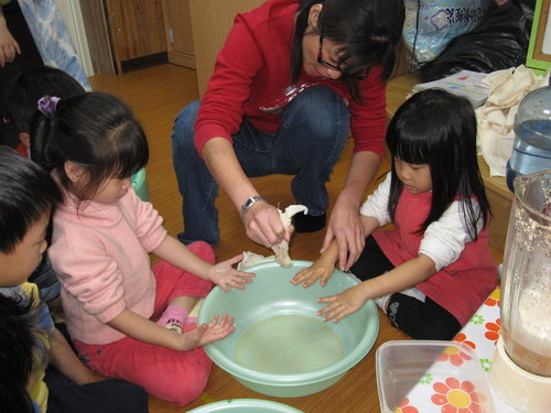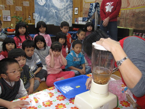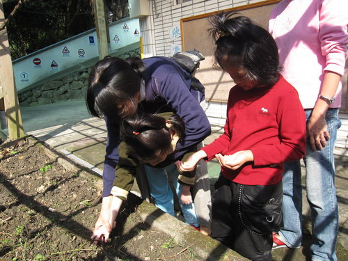 環保概念~我們請小朋友將豆渣鋪放在我們重大菁職務的根部~算是給植物養分