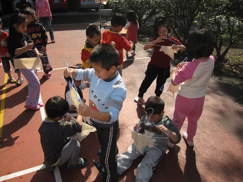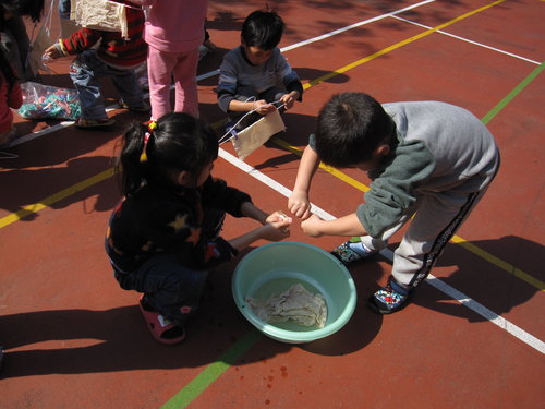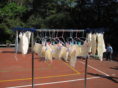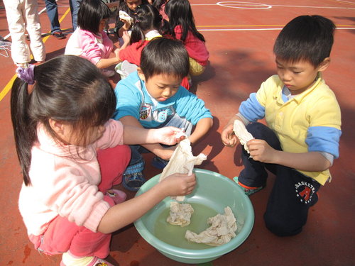 請小朋友自己把方巾擰乾→夾衣夾→掛起來