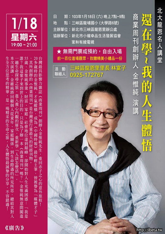 繼去年八月的阿基師演講 北大名人講堂在今年開春繼續邀請到另一位名人來三峽演講