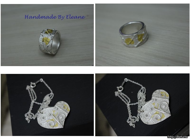 使用砂鑄壓型結合銀黏土與金箔方法作成的項鍊與戒指。
