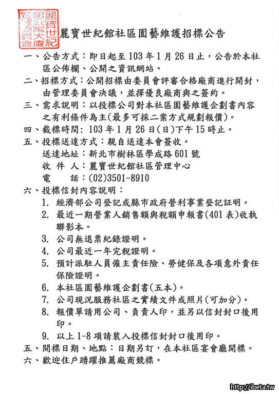 麗寶世紀館103年社區園藝維護招標