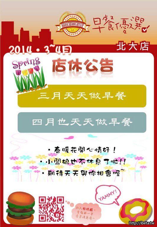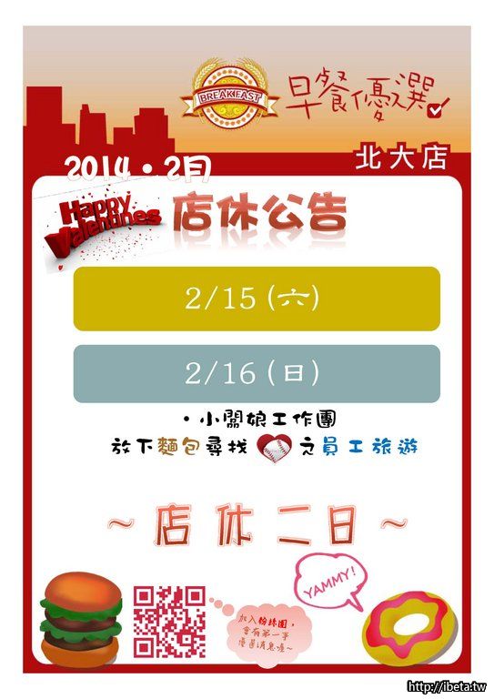【早餐優選北大店】2014年2月份 店休公告