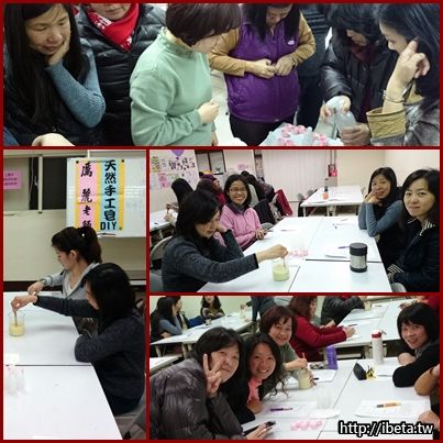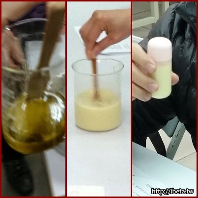 學員分組操作,各帶30克成品回去喔! 乳液適合用在全身,若覺身體太乾可以乳液之後按壓少許植物油在乾燥處,減少水分的散失~