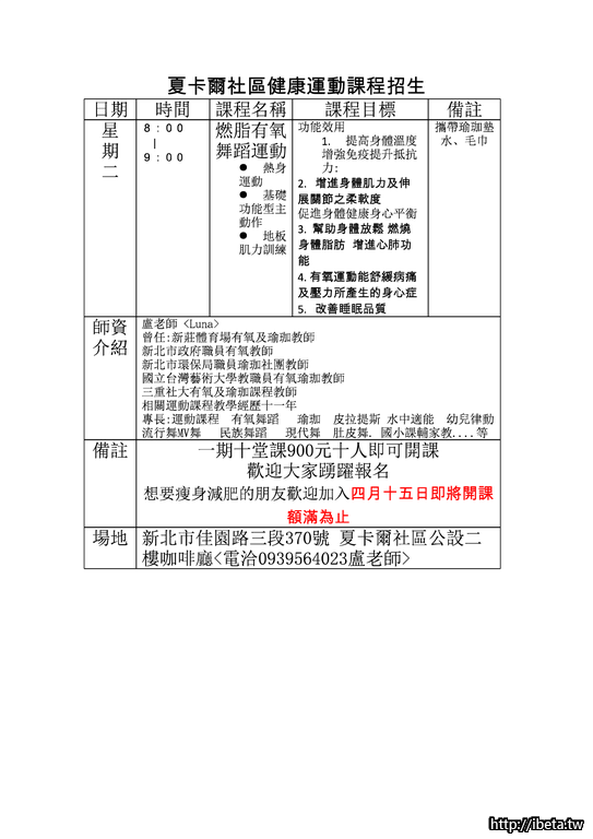 請對運動課程有興趣的朋友直接與盧老師聯絡0939-564-023