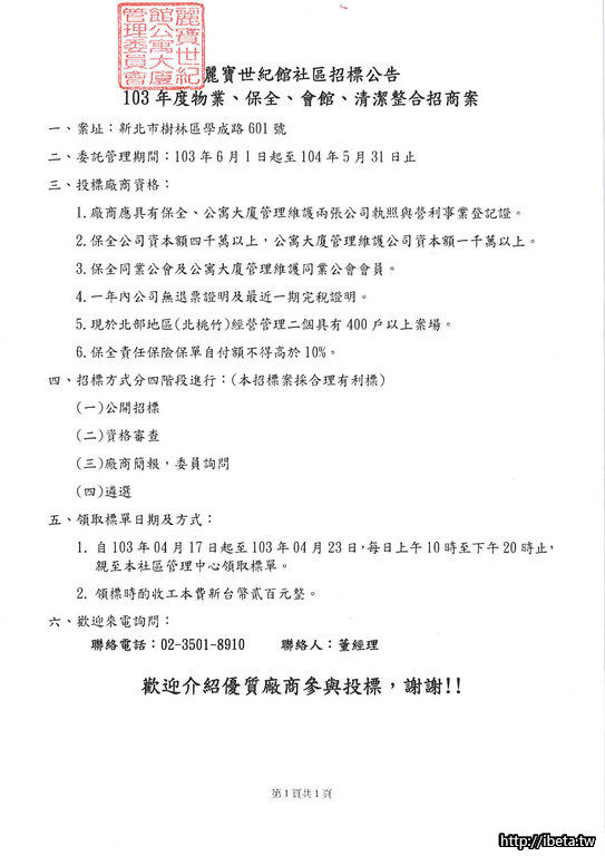 103年麗寶世紀館物業保全清潔會館整合招標公告