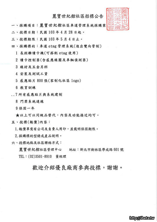 麗寶世紀館103年車道管理系統採購招商公告