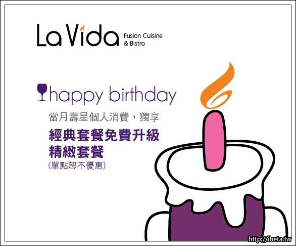 當月壽星 憑相關證件 來 La Vida 用餐 點經典套餐將為您升級精緻套餐唷