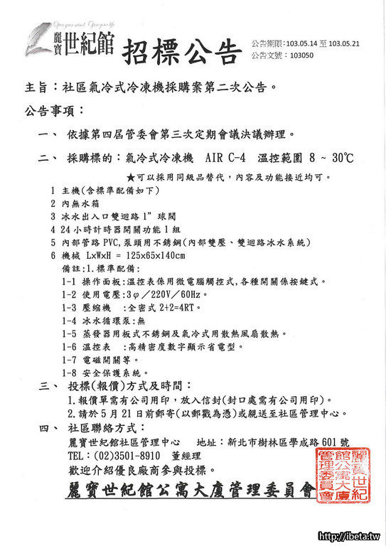 麗寶世紀館社區氣冷式冷凍機採購案第二次公告