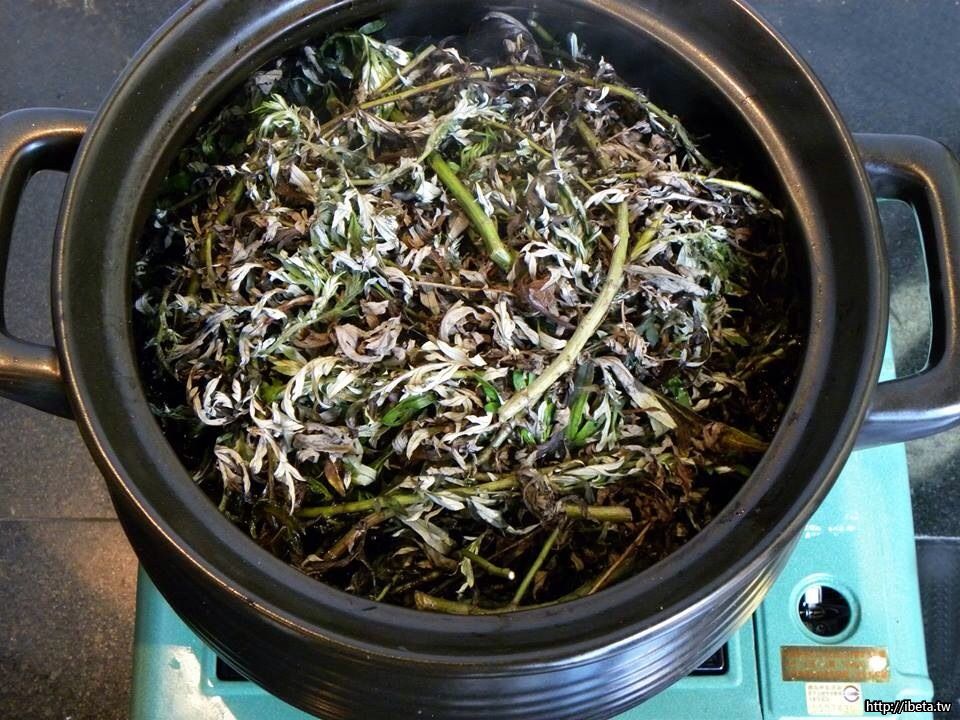 上二圖-將純黑芝麻油3,000cc倒入陶鍋,再將新鮮艾草放進鍋裡,以小火煮至艾草已經全灰褐色(已經乾硬)了,就可以關火。在煮的過程中,還需用竹筷子不斷翻動艾草