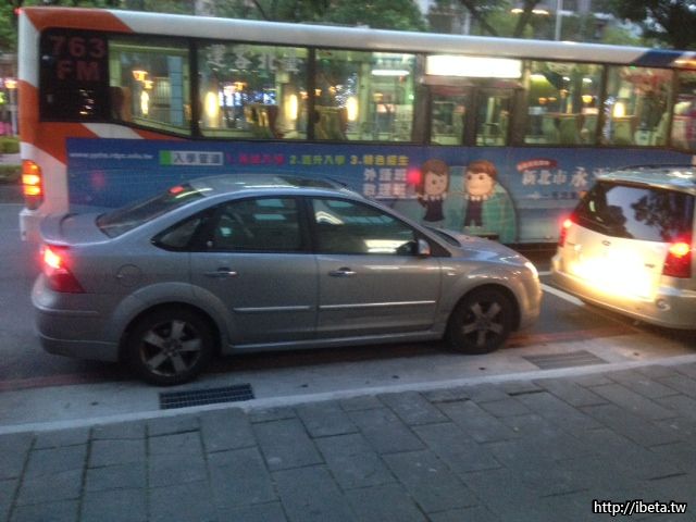 我是最後面的白色車。最前面的車停在公車格裡。