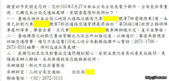 建議到三峽分局的網站上進行檢舉,之後還會回覆處理狀況~~