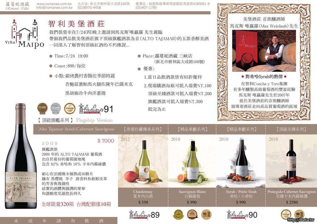 還記得上次美堡酒莊品酒會的熱烈迴響嗎?如果你上次錯過了,這次我們特別邀請到酒莊首席釀酒師來台親訪,並帶來酒莊頂級旗艦酒款(市價:7000元)的一系列品飲,與之前酒會完全不同的品項,卻是更上一層樓的高品質,喜愛智利頂級美酒的朋友千萬不要錯過嘍~