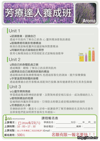 《家庭精油保健箱》《夏日美白肌-天然面膜泥DIY》《五行芳療》《NLP心靈芳療》【IAA芳療協會】