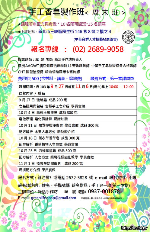 報名請註明:姓名、手機號碼 報名贈品:手工皂一玫(第一堂贈)