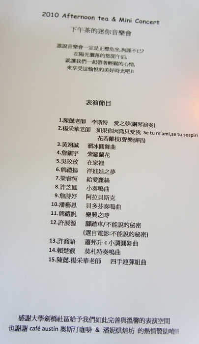 音樂會曲目與卡司主要由陳懿(Ruby)老師, 楊采華老師與她們的學生組成.