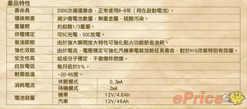 ▲這次進行測試的電池已經於日前正式在國內上市,大家可以對照一下原廠提供的性能規格,瞭解一下與傳統鉛酸電池有何不同。