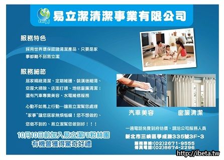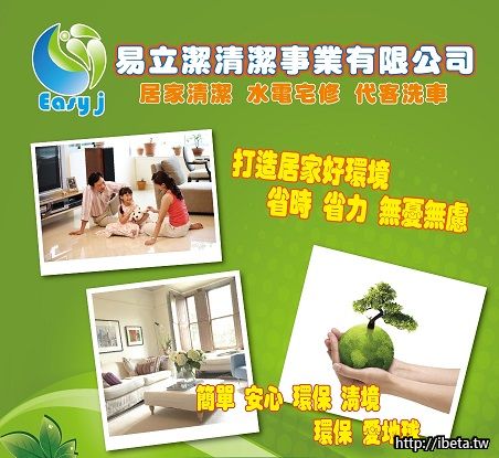 易立潔清潔事業有限公司.成立於三峽北大.,由最初本業不動產拓展業務至餐廳.清潔公司,奈米防護.奈米奇膜鍍膜加盟族.員工數近50名,由於坊間皆為跑單幫.對於居家清潔後續服務.及清潔後的保養維持.客戶安全等問題.都須由公司替您把關.簡單.安心.環保.清境.愛地球.清潔公司內部管理主要由兩個部門相互分工,設置有 1.清潔部-清潔經理.清潔組長.清潔業務,清潔媽媽2.奈米防護部-防護經理.行銷業務.防護專員.我們認為,各行業在其最初發展階段,都容易受限於客戶來源取得不易之難,及售後服務之追蹤.故每個時期都影響其階段性任務,從居家清潔步入奈米防護保養,水電宅修.代客洗車.再逐漸深入大型契約客戶,以至近期參與公家單位標案.....易立潔本著環保理念 居家清潔用品全部採用世界環保認證環保無毒抑菌之清潔產品.