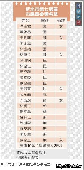 新北市議員第七選區共有21人角逐10席,現任9名議員全爭取連任,加上國、民兩黨傾巢而出,採超過半數的6席高額提名策略;無黨籍蘇有仁、陳世榮同樣聲勢不弱;親民、台聯、新黨及綠黨也不缺席推出參選人應戰。七選區也成為本次市議員選戰中,上演割喉戰的超級戰區。