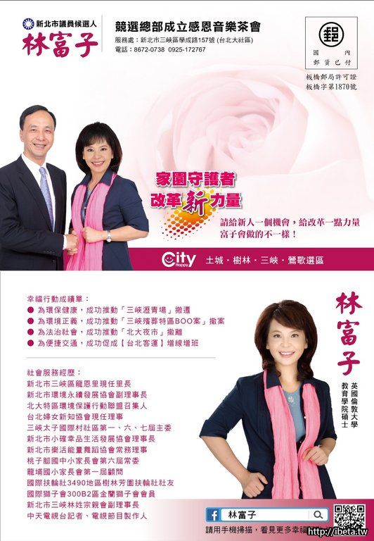 11月29日的大選將至,富子在此懇請您繼續支持最優質的新北市長~朱立倫先生連任; 也懇請您繼續給我更多扶持與鼓勵,讓敢說、敢言、敢說、敢衝的富子順利進入新北市議會,為土城、樹林、三峽、鶯歌的鄉親爭取更多福祉與建設!