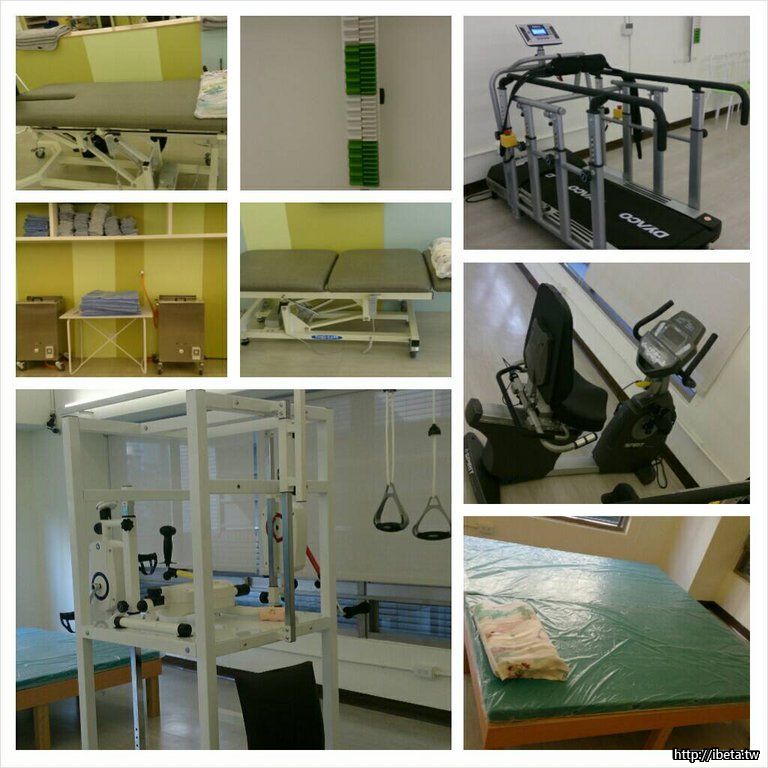 徒手運動床、電動圖手運動床、傾斜床、運動架、醫療訓練用腳踏車、醫療訓練用行走跑步機、指梯,讓物理治療師針對患者的情況給予適當徒手治療以及相關衛教運動。
