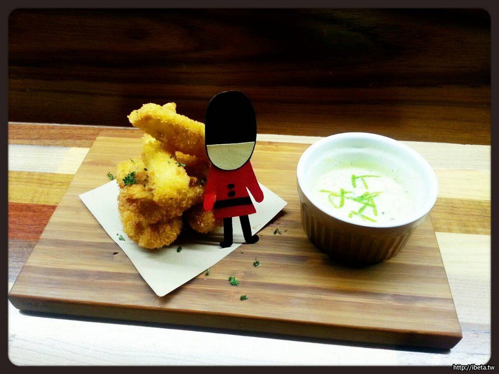 鮮炸魚柳條佐酸黃瓜檸檬優格(手工):推出後也成為顧客的最愛之一,魚柳為小聚館自行醃製、製作,醬料也是自行調配,魚柳的好味道,您會知道的!