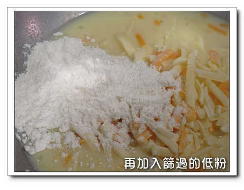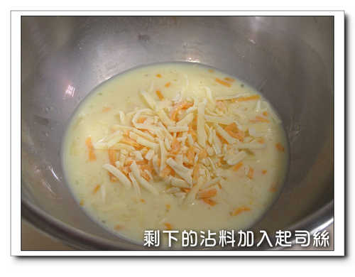 4.剩下的沾料, 加入乳酪絲跟篩過的低筋麵粉,攪成糊狀....