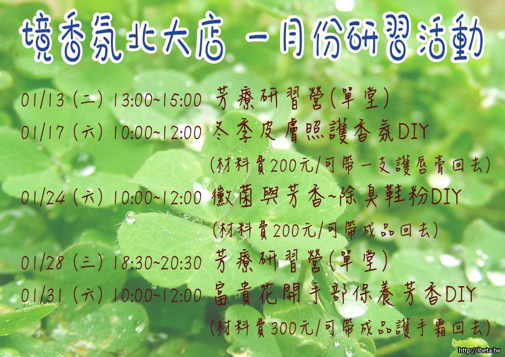 一月份推出幾場的天然芳香手作DIY課程~(另需付費的DIY小課程給想進修的朋友來學習)